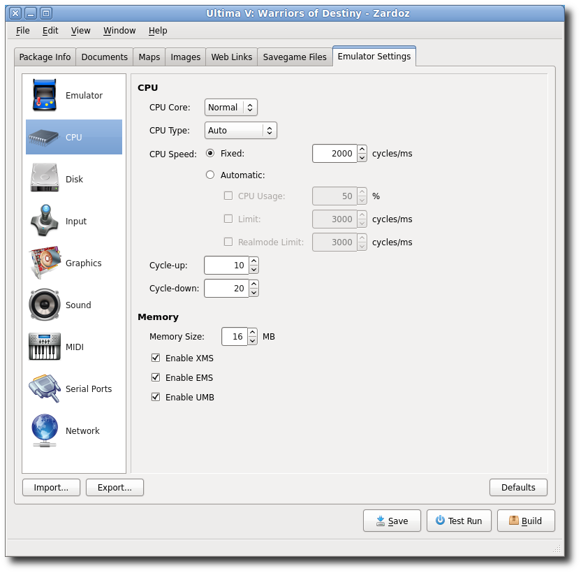 In the packager mode, Zardoz allows you to build an installable package for an MS-DOS-based game. A package includes the game's executable and data files; metadata about the game such as its title, publisher, release year, and other details; any related assets such as documentation, maps, artwork, and web links; and, of course, the DOSBox configuration settings for the game. Zardoz compiles all of this content into a single Zardoz archive (".doz") file, which you can then upload to a web server or share by some other means. (But please note: do not share games for which you do not own the copyright!)