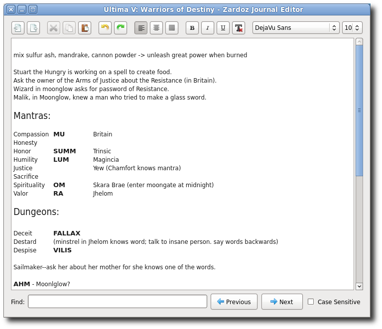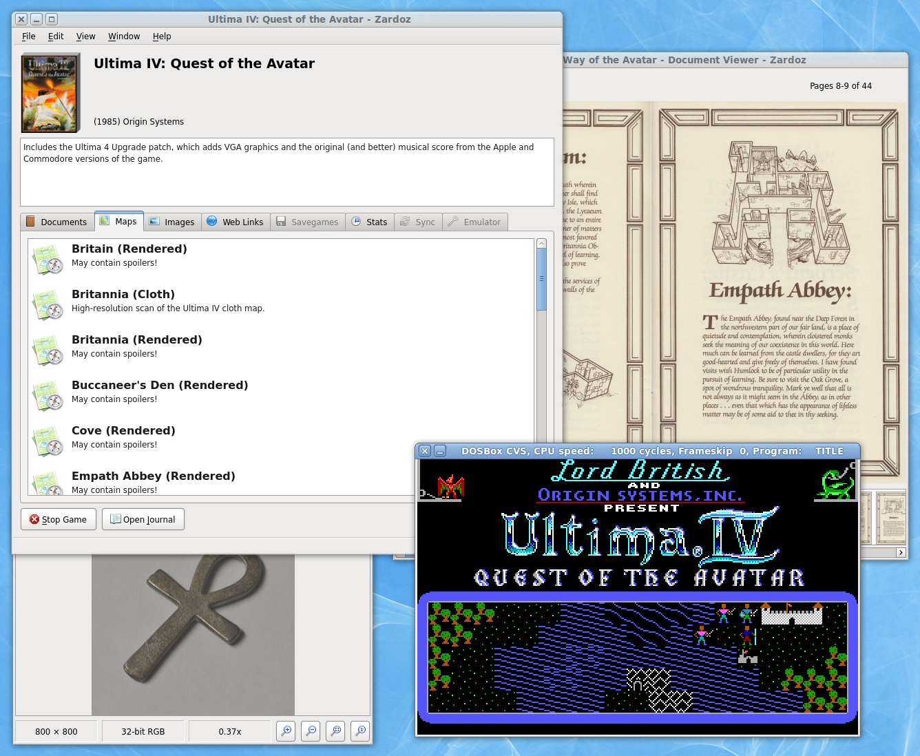 Zardoz has many other features to make your DOSBox gaming experience more fun and convenient. It has a special viewer for game maps that allows you to pan, zoom, and make your own searchable map annotations. It has a richtext journal editor for keeping game notes, which is particularly useful for role-playing and adventure games. It includes a savegame manager that allows you to keep multiple savegames, even for games that only support a single savegame, and to import and export savegames so that you can share them with others. And it has a statistics dashboard which lets you track your playing time for each game you play.